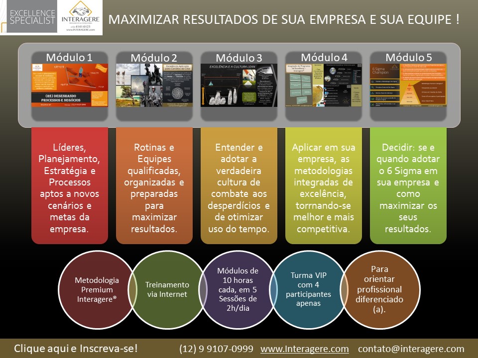 Certificação Completa Excellence Specialist Interagere®: Um curso Premium inovador, para formar Profissional Diferenciado executor, multiplicador e com domínio em Lean Sigma e Melhoria na sua empresa, com meta de 200% de ROI (Retorno sobre o Investimento) em produtividade, qualidade, prazos e redução de custos para a certificação.