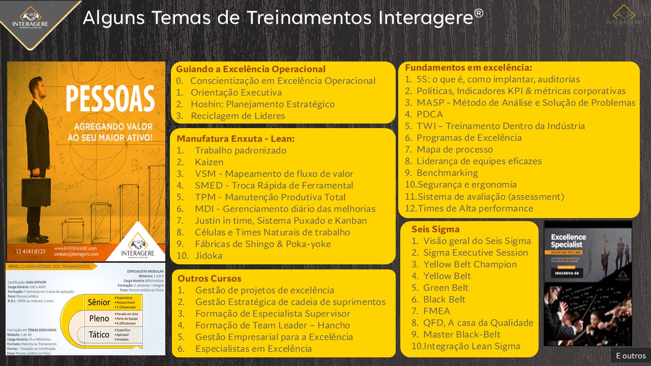 Nossa solução em Treinamentos e Mentoria em Excelência e Gestão Empresarial, tem avaliação excelente de clientes e participantes, com metodologia diferenciada em padrão e qualidade que trouxemos em 2015 para o Brasil.